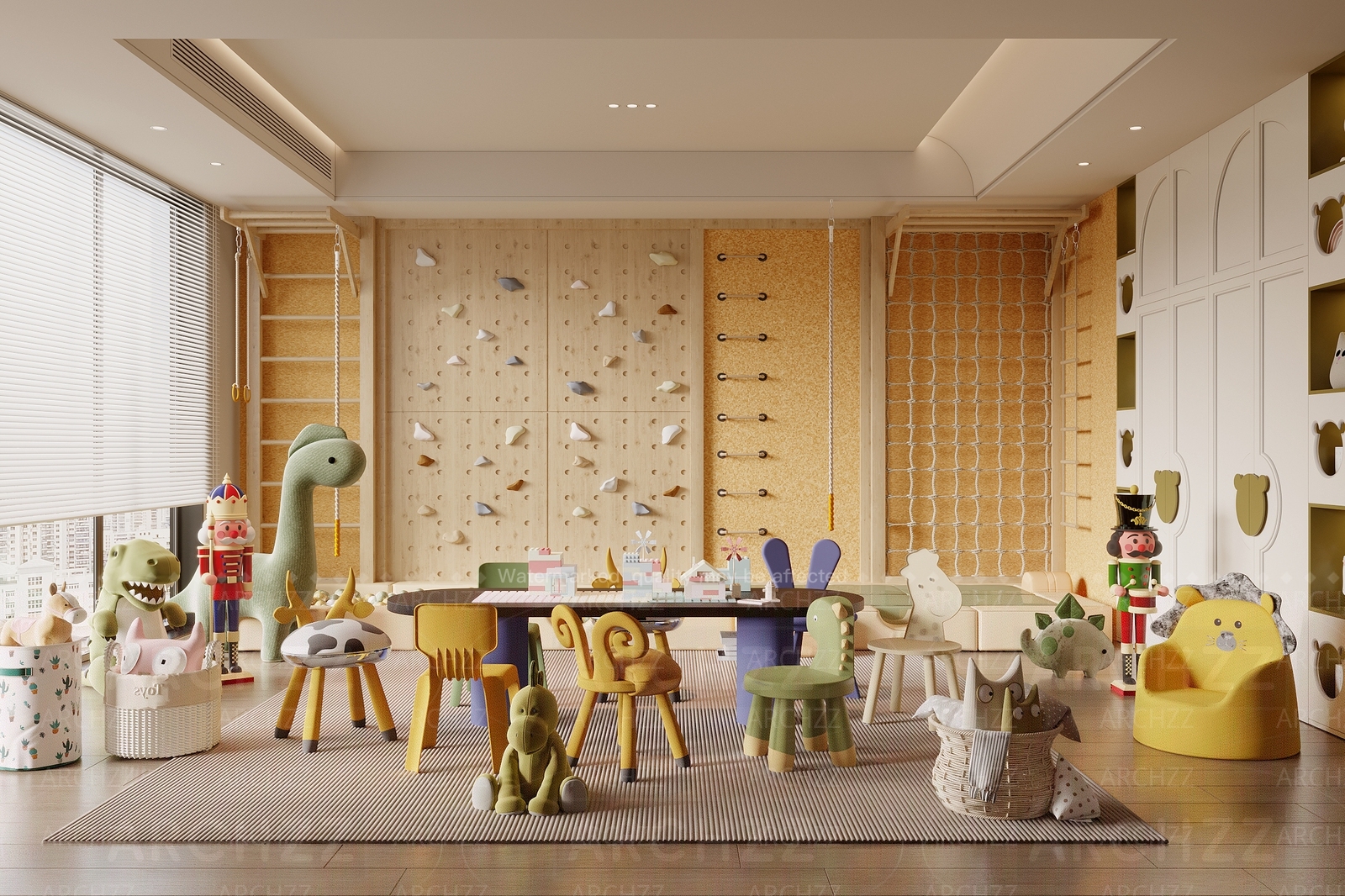 Modern Children's Entertainment Room: Children's Tables and Chairs, Climbing Frames, Rock Climbing Walls, Toys, Dolls, Toy Cabinets